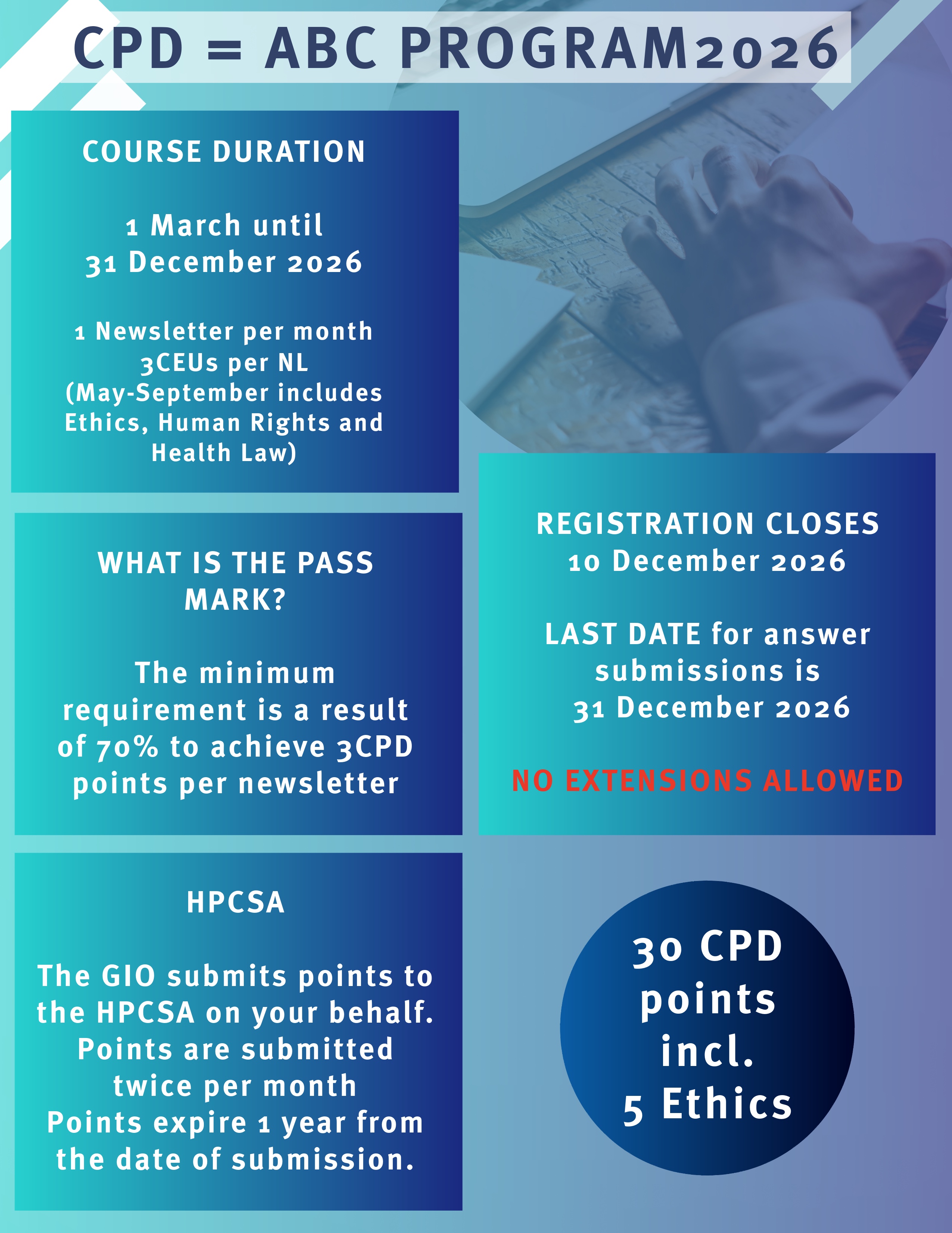 The newsletters and questions are posted on the website at the beginning of every month. They can be printed and read at leisure. There will be 10 electronic newsletters in total (commencing 1 March 2026 – 31 December 2026) each worth 3 CPD points and therefore a total of 30 CPD points for the year including 5 points for Ethics, Human Rights and Medical Law (included in May-September's newsletters) What is the pass mark? The minimum requirement is a result of 70% to receive 3 CPD points per newsletter. What if I do not get 70%? You have 2 tries to submit your answers, to acquire the required minimum. No points will be allocated thereafter. If you do not achieve 70% after 2 tries contact the GIO. How long will I have to complete the newsletters and submit my answer sheets? Newsletters and questions will stay on the web for the year. Submitting the answers on a monthly basis will keep you up to date. The last day for submissions for the year is 31 December 2026. In accordance with our accreditation with the HPCSA, NO EXTENSIONS are allowed. What is the Quality Assurance Survey request?: We request that you assess the monthly newsletters annually and highlight areas of interest that are not adequately covered. Who will keep record of my CPD status? Your answer submissions will be logged on our website and your CPD points will reflect on your certificate. All points are submitted to the HPCSA twice per month. An accurate record of your monthly points will be kept by the GIO. It remains your responsibility to ensure that your points are also reflecting on your HPCSA profile within 1 month after your submission. CPD Certificates On completion of the 10 newsletters, you can generate your certificate from the GIO website stating your total number of points with your relevant details required by the HPCSA.